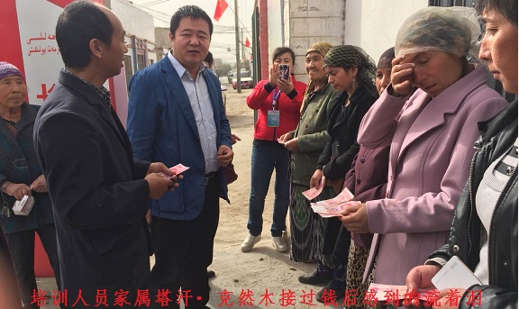 当培训人员家属塔汗·克然木接过钱后流着泪,感动地说到“感谢党和政府,感谢工作队和社区,感谢刘书记和林队长, 对我们关心和关爱,你们将我们的困难放到心上,平时入户走访了解我们的实际困难,解决我们的困难,向我们传达党的惠民政策和社会发展变化,对我们进行思想开导,每逢节日还给我们送来钱和米面油等慰问品,让我们感到身在祖国这个大家庭,我们是如此的幸福,今后我和家人一定会积极地配合社区和工作队的工作,努力将祖国建设地更加繁荣强大,让我们的生活更加幸福,家园更加美丽,新疆更加安定繁荣”。