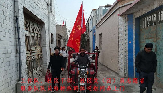 简单的现金发放仪式结束后,工作队、社区干部、社区党(团)员志愿者服务队队员组成了“两节”慰问物资发放组,分为两个小组,将米面油慰问物资送到45户孤寡老人、贫困户、服刑人员家属、培训人员家属等特殊群体家中,组员们不仅把这些慰问物资送到这些特殊群体家里,还主动为这些特殊群体中生活困难的家庭做家务,为他们清扫房间、拖地、擦洗马桶、洗衣服、做饭等力所能及的事情。