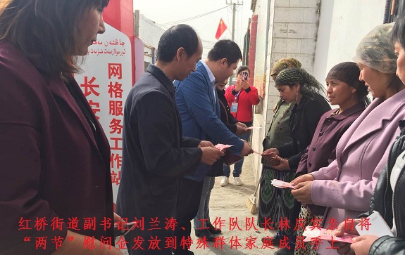 10月5日上午, 社区与工作队召集辖区7户最贫困的孤寡老人、贫困户、服刑人员家属、培训人员家属等特殊群体家庭成员,在社区网格站门前为他们发放每户200元的“两节”慰问金,红桥街道副书记刘兰涛、工作队队长林庆宾亲自将现金发放到他们手上,并向她们及其家人致以节日的问候和祝福。