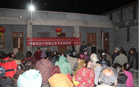 首先全体齐唱国歌拉开幕,后面村党支部副书记,工作队,妇女主任分别发声亮剑。村党支部副书记艾比布拉·阿木力说:要进一步深入开展“去极端化”工作,进一步激发党员干部、各族群众声讨“三股势力”、打击“三股势力”、与“三股势力”作斗争的主动性和积极性。干部群众要以吾布力喀斯木·买吐送同志为榜样,深入开展形式多样的发声亮剑活动,切实提高执行力,坚决不做“两面人”。
