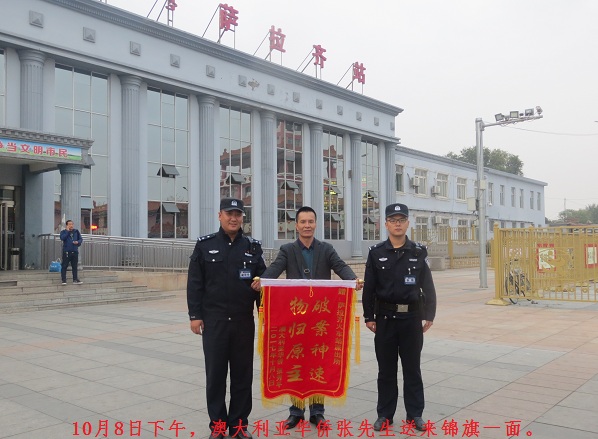 清风网讯:(通讯员 包头铁路公安处 汤彦冬)10月8日下午,澳大利亚华侨张先生将一面写有“物归原主,破案神速”的锦旗送到了萨拉齐火车站派出所。他紧紧握住民警的手,感谢派出所民警为其找回数万现金、银行卡等个人重要物品。