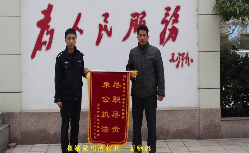 近日,山东省济阳县崔寨镇前街村村民杜永鹏将一面写有“尽职尽责 秉公执法”的锦旗送到山东省济阳县公安局崔寨派出所民警手中,以表达对崔寨派出所办案民警尽职尽责为民解忧,全心全意为辖区居民服务的感激之情。