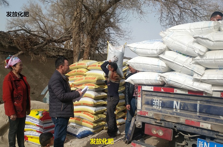 3月12日,阿克苏地区工商局驻沙雅县英买力镇尕哈勒铁热克村工作队为劳动能手、贫困村民和困难群众等50余户村民捐赠化肥4吨,助力村民春播生产。