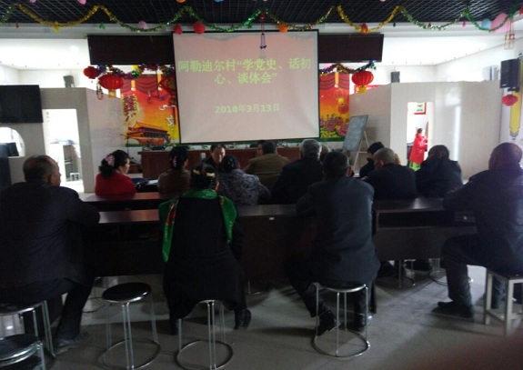 清风网讯:(通讯员 沙雅县市场监督管理局 王丽梅)为了深入学习贯彻党的十九大精神,让“不忘初心,牢记使命”的主题不仅仅挂在嘴上更要记在心上落实到事上。同时持续深入推进“两学一做”学习教育常态化制度化,引导党员干部进一步树牢“四个意识”争做合格党员, 2018年3月15日,阿勒迪尔村工作队组织村内党员干部开展“学党史、话初心、谈体会”主题活动,本次活动由村党支部书记司马依·木沙主持,工作队队长、第一书记邹梦宁主讲,参与党员干部47人。