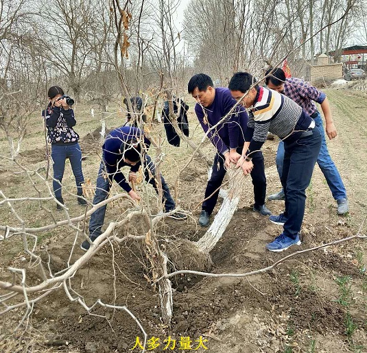 因为无法机械作业,要清理这些套种在冬小麦中的枣树,我们只能采用人工挖除的方式。大家纷纷拿起了坎土曼、斧头、铁锹、砍锛,热火朝天的干了起来。别看这些枣树树干不大,但是树根很深,需要先用坎土曼挖出一个坑,再用砍锛或斧头把大根斩断,才能完成一棵树的挖除工作。虽然是个力气活,但大家热情高涨、干劲十足,不喊苦、不叫累,挖土、断根、搬树干,相互配合、齐心协力,一个下午就将一亩多地里30多棵影响树间距的枣树全部清除。