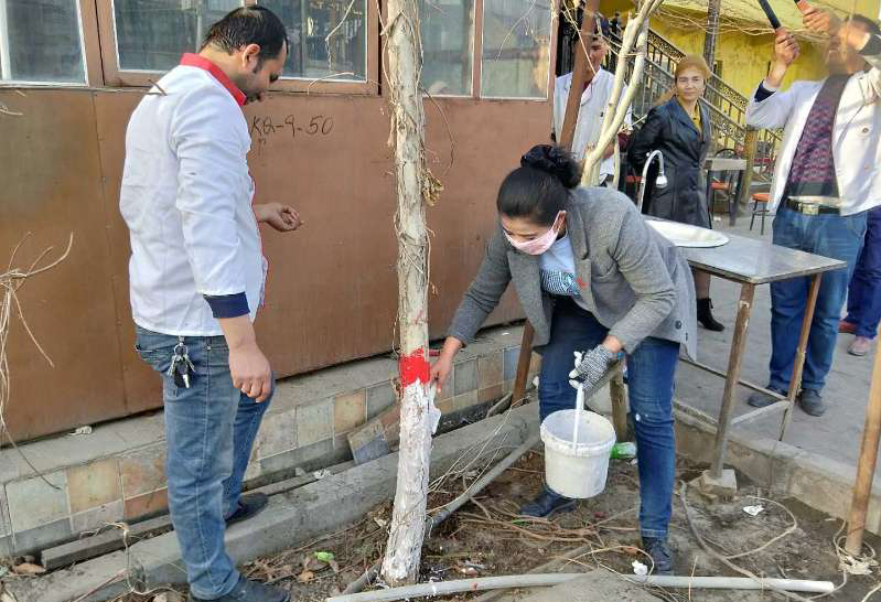 村党支部书记陈志刚、第一书记塔依尔·乃买提,带领着党员、村干部一同去花园村新垦农场路,将路两旁林带内的树木进行刷树护树。活动中,大家带着桶、石灰、刷子等工具分别来到分包路段。两两配合着,一人拿尺子量,一人刷,即使石灰水溅到身上,也丝毫没有影响大家的热情。在大家共同努力下,辖区内所有树木都穿上了白色“新衣”,保护它们能够在春天健康生长。