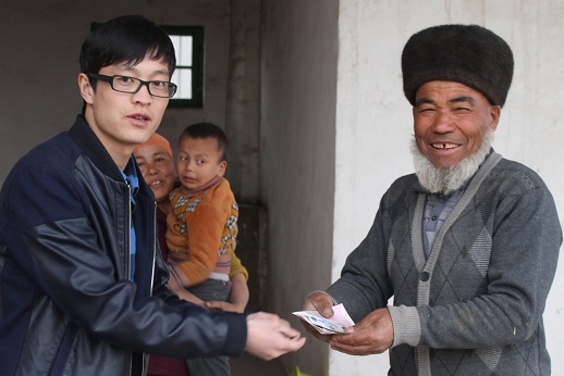 幸福的获得感。图为3月21日,新疆沙雅县社保局驻英买力镇墩买里村“访民情、惠民生、聚民心”工作队队员登门入户发放低保金时,低保户脸上露出了灿烂的笑容。