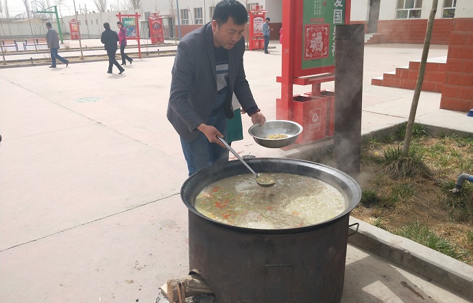 村民海日古丽·米吉提早在昨晚已经将五谷杂粮、餐具、灶具准备好,一大早来到村委会准备做“诺肉孜节”粥时,发现锅里水的已经沸腾,羊肉、牛肉、五谷杂粮已经清洗好准备下锅,民汉群众齐动手,不一会浓浓的香气飘溢在村委会院内,各族群众品尝美食、诉说心声,拉近感情距离、增进情感交流,在村委会内呈现出一道美丽的民族团结风景线。