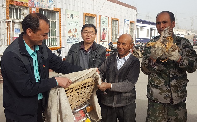 3月21日,沙雅县卫生局驻托依堡勒迪镇胜利村“访惠聚”工作队和派驻后盾单位卫生局干部自掏腰包筹资2640元购买480只鸡苗,免费发放给了16户贫困户。图为工作队员正在登门入户给困难家庭送鸡苗。