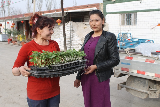 贫困户热孜万古丽说:“非常感谢党和政府对我们贫困户的关怀,我们种植蔬菜不但可以增加收入脱贫,自己和家人还有菜吃”。
