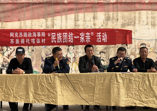 活动中,阿克苏路政海事局书记刘健、局长居来提一一致辞,表示:“今天,到村里开展的这次“民族团结一家亲”结对认亲活动,是为了进一步加深我单位职工与本村群众的交往交流交融,关系更加密切,让民族团结的思想基础和情感基础更加稳固,民族团结的根基更加扎实稳固,大家一同筑起维护稳定的铜墙铁壁和钢铁长城,让民族团结遍地开花。”