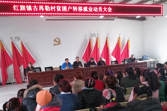 变“要我脱贫”为“我要脱贫”。图为阿克苏地区交通运输局“访惠聚”驻村工作队召开贫困户转移就业动员大会时的情景。