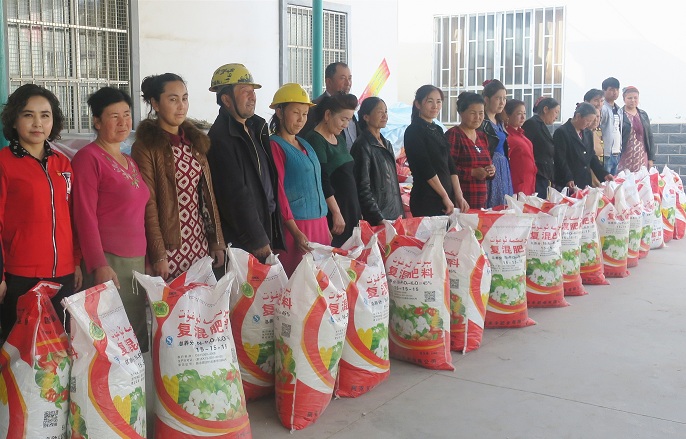 解群众生产燃眉之急。图为3月23日沙雅县市场监督管理局驻琼古勒巴格村“访惠聚”工作队派驻后盾单位给困难群众发放化肥。