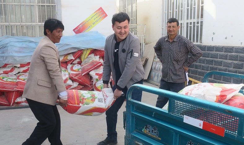 把服务送到群众家中。图为沙雅县市场监督管理局驻琼古勒巴格村“访惠聚”工作队队员在装化肥给困难群众送去。