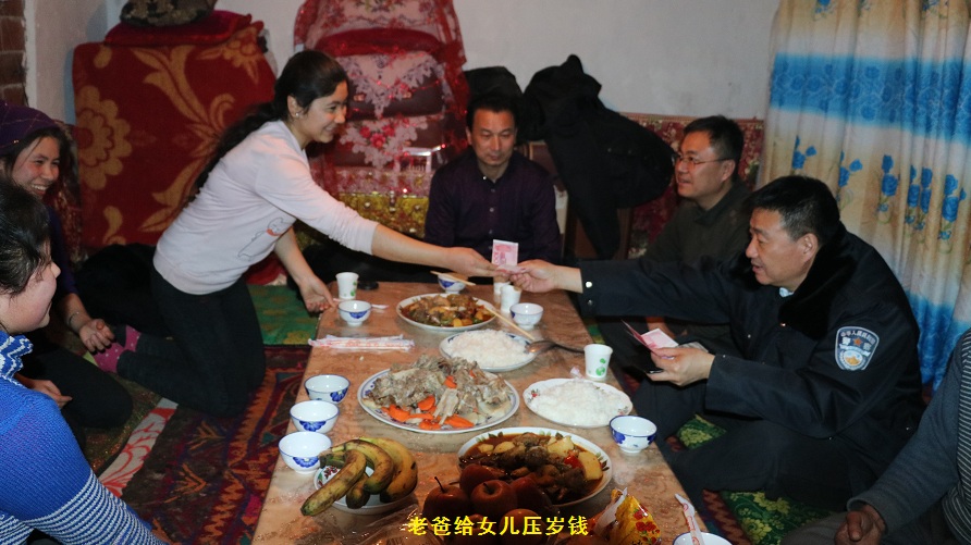 去年暑假,在新疆师范大学上学的阿热孜古丽·托合尼亚孜回到家乡,得知村里好多人都有汉族亲戚,羡慕不已,她就来到工作队找到了马士军,将自己希望有一个汉族亲戚的愿望告诉了他。没想到在不久后的“古尔邦节”联谊会上,阿热孜古丽和马士军结为了亲戚。原来当天在搞活动的时候,正好缺个翻译,马士军就对身旁的阿热孜古丽说,闺女过来帮我翻译吧,这也就无形中告诉了大家,这就是他的闺女。这闺女也很机灵,接着对在场的父老乡亲们说,这就是我“爸爸”,顿时在场的村民们为这对“父女”送上了热烈的掌声,也算是俩人“父女”缘分的一个见证。