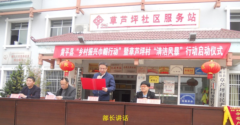 清风网讯:(通讯员 旧州镇科教文化中心 张玉良) 3月23日上午9点,在贵州省黄平县旧州镇草芦坪村委会广场举行黄平县“乡村振兴巾帼行动”暨草芦坪村“清洁风暴”行动启动仪式。出席启动会的领导有县委常委宣传部长廖永伦、县妇联主席杨国荣,旧州镇党委书记潘开举,全县11个乡镇妇联主席、专职副主席,草芦坪村两委成员、组长、“十户一体”户长、保洁员、办酒协会理事、老年人协会负责人、村民代表、其他协会负责人以及红梅小学2至6年级的老师和学生共800余人参加启动仪式。启动会由县妇联主席杨国荣主持,廖永伦部长作重要讲话。