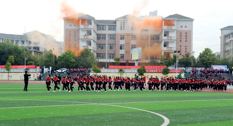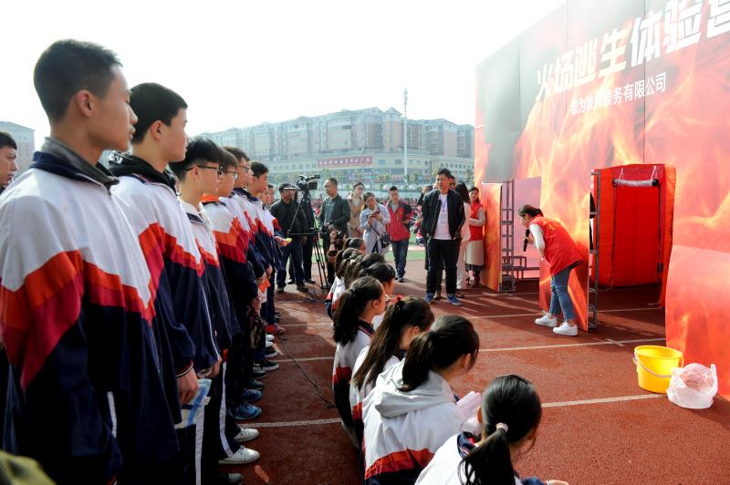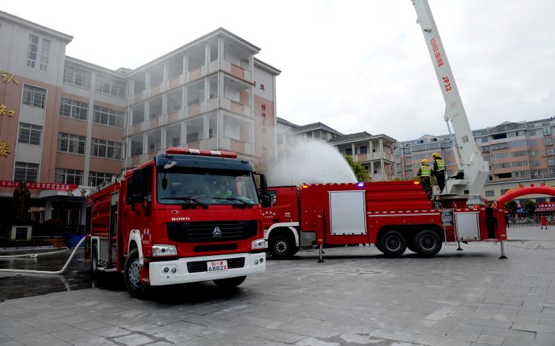 上午8点30分,“呜——呜——”随着尖利的警笛声,河西学校四五六年级学生迅速离开教室,在浓烟中,在工作人员指导安排下,他们口捂毛巾,弯腰扶墙,有序快速地疏散着。不到3分钟,一千二百余名师生安全撤离。随即,怀化经开区消防大队3辆消防车开启警报,驶入校园,现场演示高空喷水灭火。