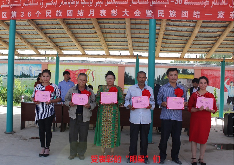 清风网讯:(通讯员 阿克苏地区财政局 戴强) “拜克热·芒力克,夫妻二人在二农场汉族小学当厨师,积极照顾、帮助汉族小朋友,以实际行动践行民族团结;艾则孜·斯依提,与被维吾尔族家庭收养的汉族同胞交朋友,同吃、同住、相互帮助,积极做民族团结表率;吐热汗·肉孜,低价出租院落给汉族邻居,相互帮助,共同致富…”5月26日,沙雅县古勒巴格镇音其开村大院内,红旗飘扬,歌声嘹亮,6名胸配红花的“民族团结先进个人”在村民热烈的掌声和喝彩声中兴高采烈的走上领奖台,成为了音其开村当天最耀眼的“明星”。