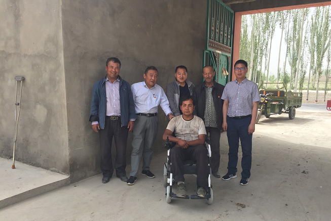 原来是大叔的儿子左手和右腿功能丧失一年多了,行动不便,走的最远的地方就是在家门口边上的石头墩子上晒晒太阳,工作队在走访中了解到这个情况后,主动和上级残联部门联系,申请到电动轮以后工作队派人前往领取送到米吉提·扎依提大叔家中,大叔激动的说道“感谢党和政府,感谢工作队,巴郎终于可以走出家门了”。