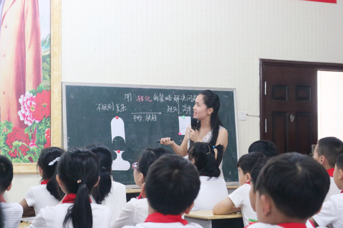 此次活动的主题是“解决问题的策略”,采用“2+1”的模式,即两节观摩示范课加一个专题讲座。城区五小李月红老师执教的《用转化的策略解决问题》以曹冲称象的故事引入,引导学生感受其中的转化思想。在比较两个不规则图形大小的问题时,通过一系列具体操作活动培养学生的动手能力,使学生对图形的具体转化方法有了清晰的认识。