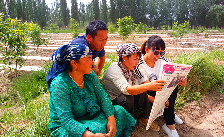 5月28日,拜城县委办驻村工作队队员赵新红(右一)走进田间地头向村民宣讲党的十九大精神及惠民政策。