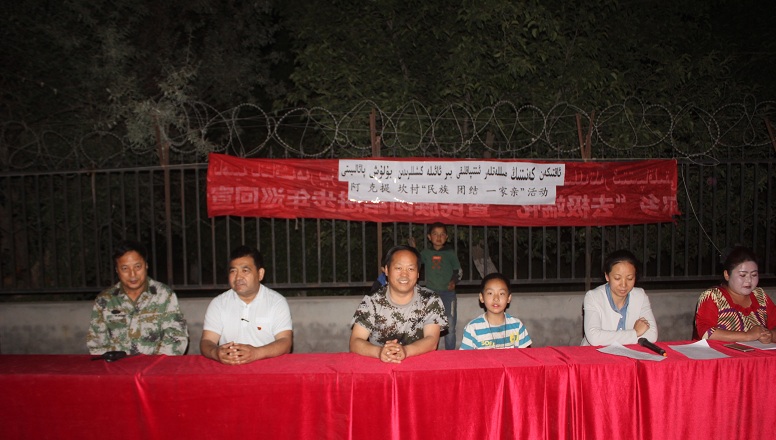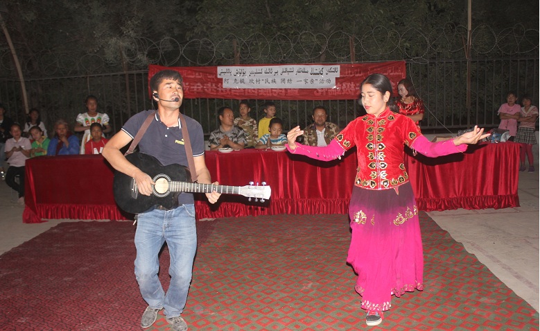 2018年5月27日晚,阿克提坎村组织开展民族团结一家活动,全村村民200余人与驻村工作队、村干部一起共同庆祝民族团结,活动中穿插着欢乐的歌舞、时装模特、吉他弹唱、有奖知识问答,并发放奖品,阿克提坎村回荡着阵阵掌声、欢呼声,气氛热闹极了。