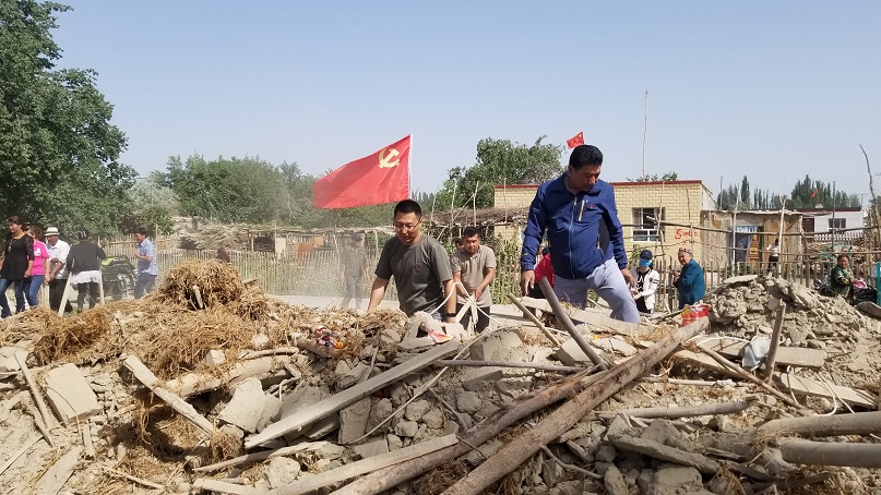 5月25日,库木布拉克村52名党员、28名村干部分两拨分别到达艾则孜·吾杰克和依力哈木·克然木家,大家按照分工,井然有序,将房子里的家俱、农具和日常用品按照主人的要求分别搬走。一切准备就序,挖掘机轰然开动,危房在大家的眼皮下,被推倒了,几经作业,废旧木料被刮到一边,党员干部带头,你扛我抬,清除房屋垃圾。看到这种场面,村子的群众主动加入到我们的队伍,四五个年轻人争抬大木料。