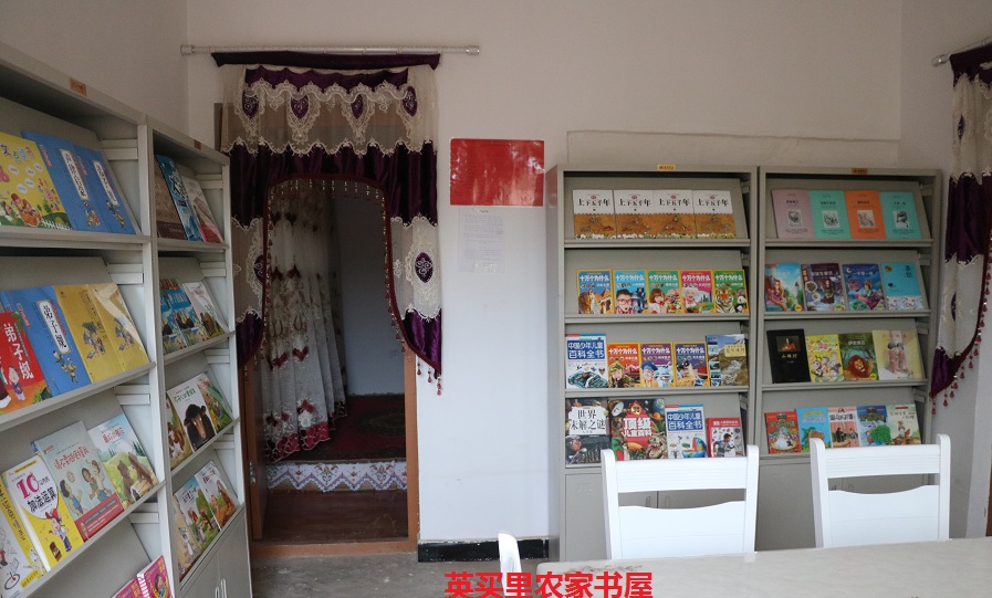 阿尤甫·莫来克是英买里村普普通通的维吾尔族农民,为人憨厚朴实,但他却热爱读书,渴望办一个农家书屋。工作队了解到他愿意腾出一间房子,作为免费图书馆的愿望后,为农家书屋赠送了4个书柜,工作队副队长吴鹏发动亲朋好友捐赠了首批300本图书,经过精心布置,“农家书屋”挂牌了。