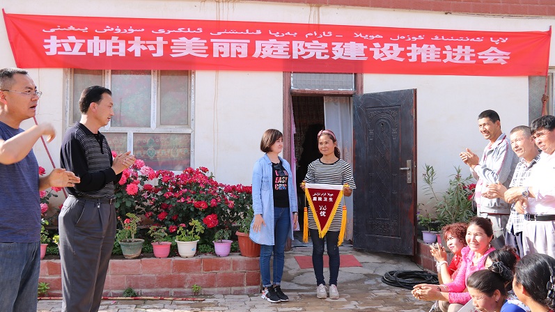 镇团委书记古孜丽阿依·木合塔尔分别为三个示范户颁发了“庭院卫生流动红旗”,激励其他村民向他们学习,积极建造美丽卫生的新型庭院,倡导文明新生活。