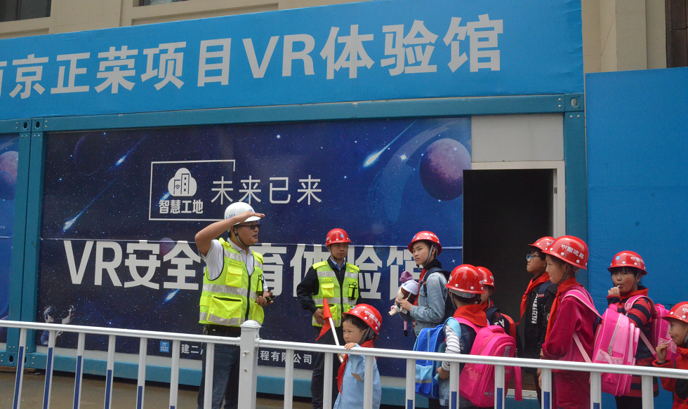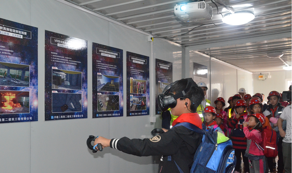 “叔叔,那个建筑身上穿的是什么呀,最高的长方体为什么会动呢,还有这个好神奇呀?”“建筑身上穿的衣服是安全网,正在动的那是塔吊,这里是我们的VR体验馆。”项目经理正在向小朋友们耐心的解说。