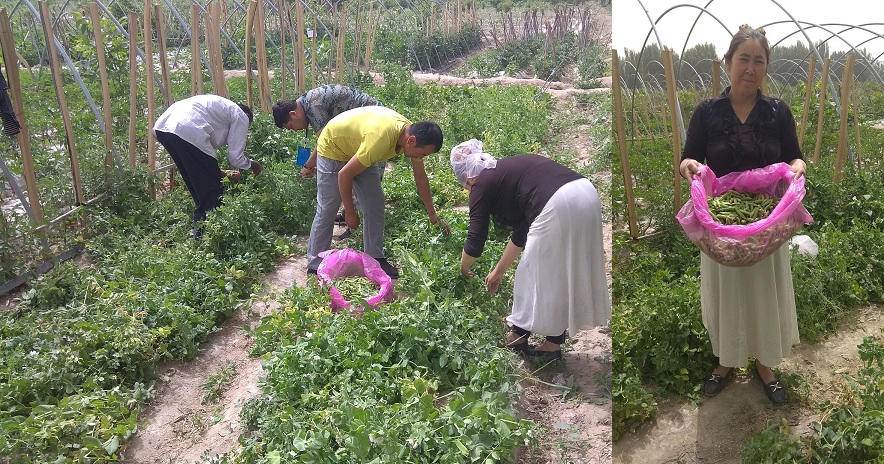 布萨热木·热西提家有四口人,没有耕地,两个孩子在上内高班,今年通过享受扶贫项目(小拱棚)种植了赤豆和辣子,听到消息后的她心里就想着“如今正值吃青豆的好时节,我得快些把家里的赤豆快些采摘了......”。