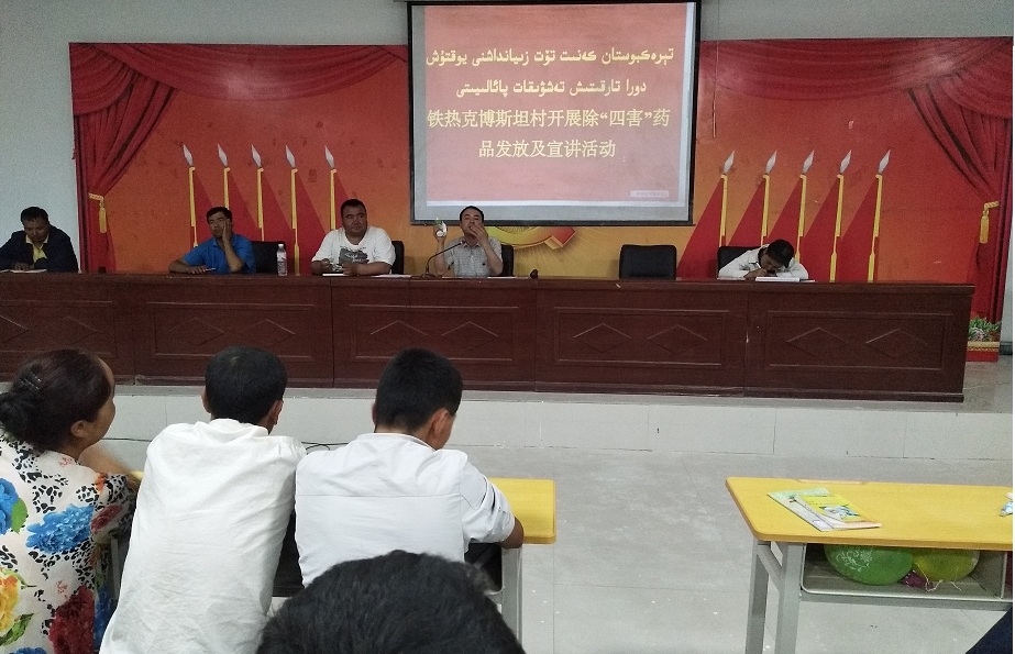 清风网讯:(通讯员 沙雅县水利局 李才德)6月2日,沙雅县水利局驻央塔克协海尔乡铁热克博斯坦村工作队组织村两委班子、群众500余人,在村级活动中心开展发放除“四害”药品和相关知识宣讲活动。