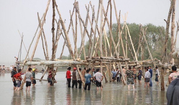 防洪防汛场面壮观震撼。河堤对岸,几十名村民爬上爬下将树干制作成“杩槎”(由三根木桩绑扎而成的三脚架)后,将做好的“杩槎”推向岸边固定,再将几座“杩槎”相互固定,加以树枝、石块等形成防护堤,这是一种古老的水利工程结构,起到调节水量,抢险堵口和防洪护岸的作用。在这里,拜什艾日克镇的村民们团结一心、众志成城,用智慧和勤劳保护着大家共有的家园。