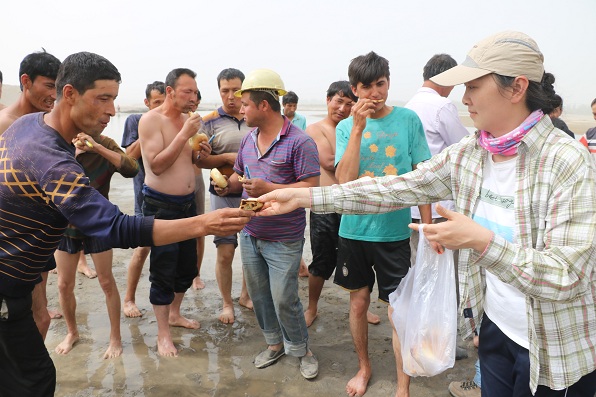 新疆农业大学驻阿瓦提县拜什艾日克镇托万克拜什艾日克村工作队队长康华带领工作队员们与新疆农业大学“民族团结一家亲”干部,水利与土木工程学院院长唐新军、副院长林丽、教务处副处长孙霞、教务处老师唐茜等一行不辞辛苦,顶着酷暑,携带馕、烤包子、火腿肠、矿泉水等慰问品看望慰问托万克拜什艾日克村参加防洪防汛的八十余名村民。