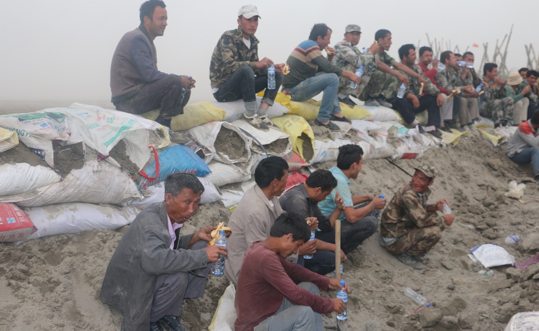 买合木提·木合台尔是乌鲁却勒镇的带队负责人,据他描述群众已经在这里坚守了四天四夜,目前已经修筑防洪堤坝6处,合计2千米,预计5号晚上全部完工。