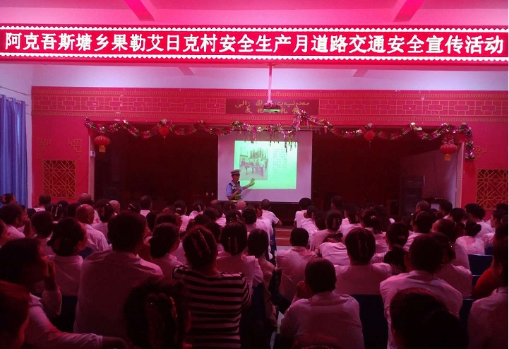 清风网讯:(库车县司法局 魏俊立)2018年6月是全国第十七个“安全生产月”,为深入宣传道路交通安全法律法规,提高广大农牧民群众的交通安全常识,增强交通参与者的交通安全意识,有效预防和减少道路交通事故发生,营造平安和谐的道路交通环境。6月6日晚,库车县司法局驻果勒艾日克村工作队邀请库车县公安局交通管理大队齐满中队的陈云警官在村文化大礼堂举行了道路安全法宣传活动。