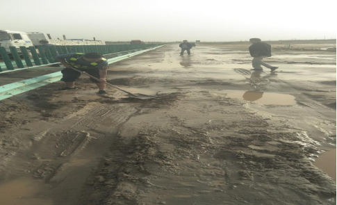 19时30分许,暴雨洪水基本停止,路政执法人员一直坚守在前线。对公路受损情况再次勘验发现G3012线k625至k637公里路段之间,多处存在高速公路路面堆积淤泥,淤泥厚度约有50厘米。库车路政管理局再次与公路养护部门联系后,公路局出动了四辆铲车对公路路面的堆积淤泥进行铲除,截止目前公路经连夜抢修和清理淤泥,6日被山洪阻断的G3012线库车至新和路段恢复通行。