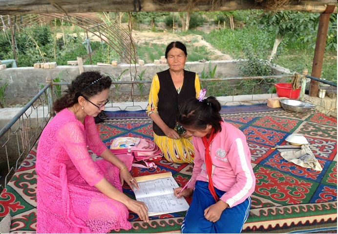 图为工作队成员帕提古丽·喀斯木为自己的帮扶学生辅导功课