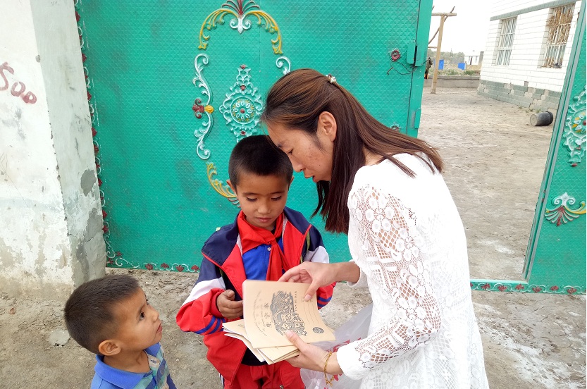 工作队成员王娟给艾力亚尔·亚森给作业本