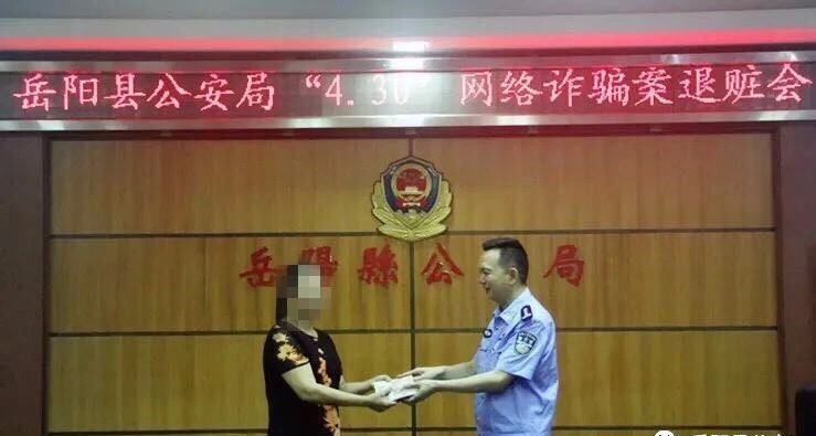 清风网讯:(通讯员 陈斯) “岳阳县公安局太给力了!不但很快破了案,还帮我全部追回了被网络诈骗的5万多元钱,真是太感谢贵局和全体办案民警了!”6月6日8时许,“4.30”网络诈骗案的受害人毛女士一大早赶到岳阳县公安局,将印有“破案神速显警威 千里追赃为人民”字样的锦旗送交到该局党委副书记、政委陈遇春手中,向警方表达崇高敬意和无限感激。随后举行的退赃会上,陈遇春同志一边语重心长地提醒毛女士“吸取教训,谨防受骗”,一边将55299元的涉案赃款全部退还受害人毛女士。