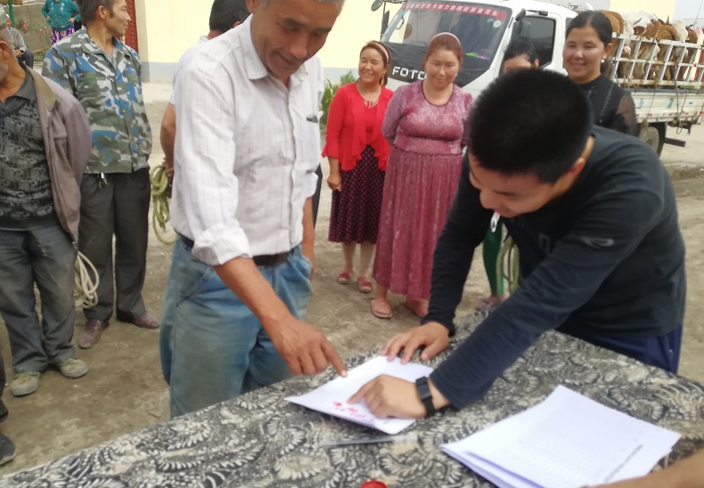 贫困户艾买尔·买买提(左三)签字确认领取扶贫牛
