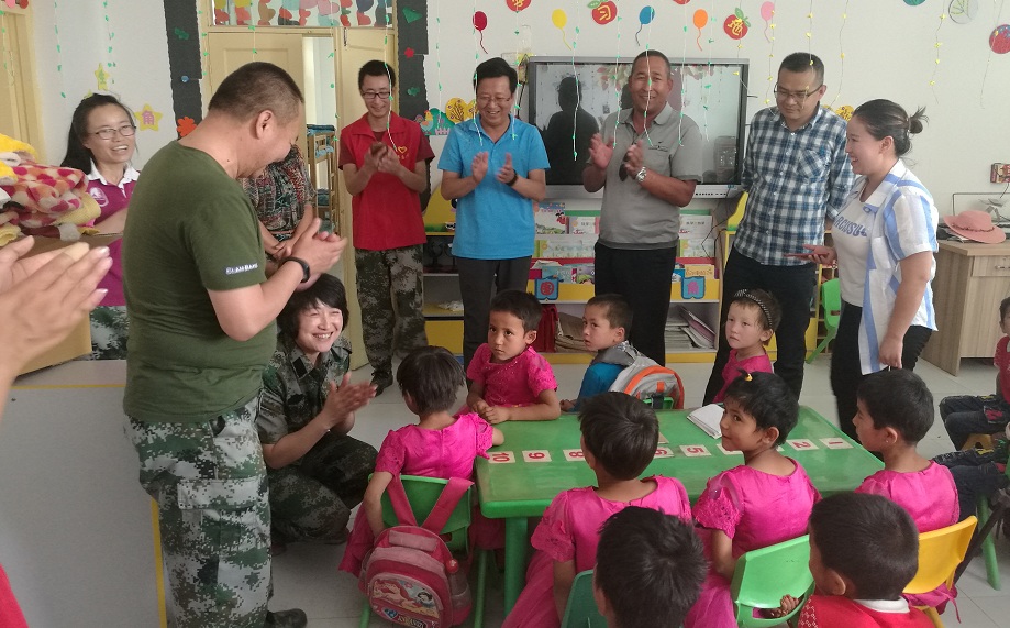 李静书记还为托万克兰干村幼儿园的小朋友送去了8团干部职工为他们准备的书包和衣服,送上了“儿童节”迟到的礼物。小朋友收到漂亮的衣物,很感动。