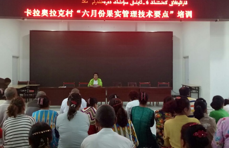 2018年 6月9日晚上九点,在卡拉奥拉克村民服务活动中心,驻村工作队组织本村全体村民开展农牧民夜校,集中学习《6月果树管理技术要点》。这次培训主要是针对广大农民群众的宣传和培训,帮助切实提高林果业管理水平,促进农民增收。
