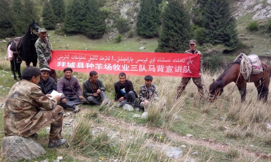 清风网讯:(通讯员 拜城县水利局 段波)在拜城县种羊场牧业三队草原上活跃着一支“马背宣讲队”,该宣讲队是2017年由业务能力强的连队科技干部、畜牧干部以及“访惠聚”驻村工作队队员组成的队伍。党的十九大召开后,他们骑着马穿梭于各山区牧民点宣传党的十九大精神和党的惠民政策,成为种羊场牧业三队的一道亮丽风景,深受各族农牧民的欢迎。