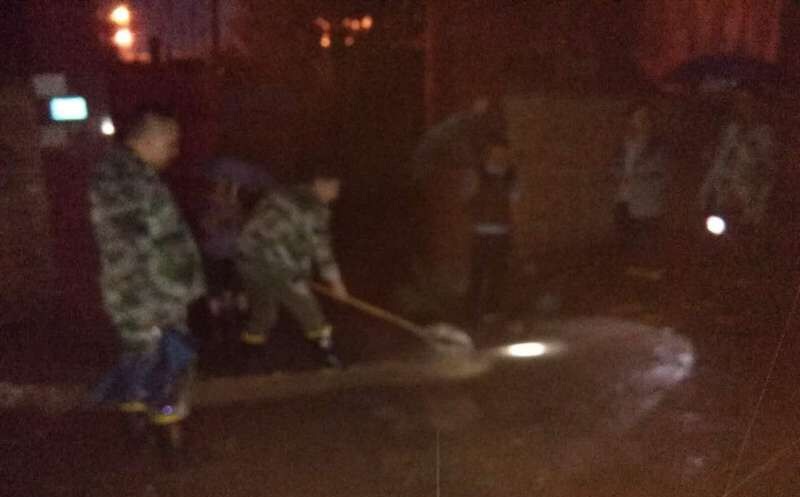 夜幕降临了,干部们在非常泥泞的小路上深一脚,浅一脚、一步一滑的来到居民家中,对居民进行安抚和帮助,双脚踩在又臭又脏的泥水里,清理疏通院内聚集的雨水,一锹一锹堆砌雨水倒灌的防护栏,和居民一起承接屋顶漏下的泥水………经过两个多小时的奋战,干部们脸上花了,手刮破了,脚泡裂了,全身被雨水淋湿了,但大家心里悬着的心终于放下来了,居民也终于不再担惊受怕,可以睡一个安稳觉了。