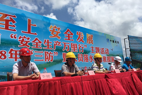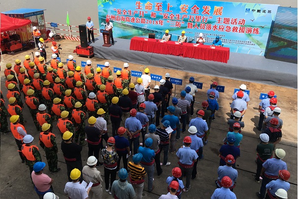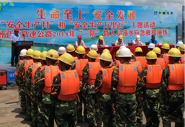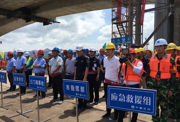 清风网讯:(通讯员 中建七局交通公司 李春雄)6月15日,由台州市沿海高速公路工程建设指挥部、台州三门海事处、中建沿海高速PPP1标总承包部和杭州交通监理咨询公司联合举办,中建台州湾大桥第五项目部承办的沿海高速“三防”(防台防汛防雷)暨人员落水应急救援演练现场观摩会在中建台州湾浦坝港特大桥南岸第19号主墩承台上举行。台州市交通建设工程质量安全监督站党委书记张伟、沿海高速指挥部总指挥助理赵洋福、台州三门海事处副处长李胜亮、中建沿海高速总承包部项目经理李健、杭州交通监理公司总监何为、中建台州湾大桥第五项目经理贾晓锋和参加“三防”演练观摩的沿海高速各大桥工程项目生产经理、安全负责人和有关监理150余人参加观摩。中建沿海高速总承包部安全总监徐建如主持大会。