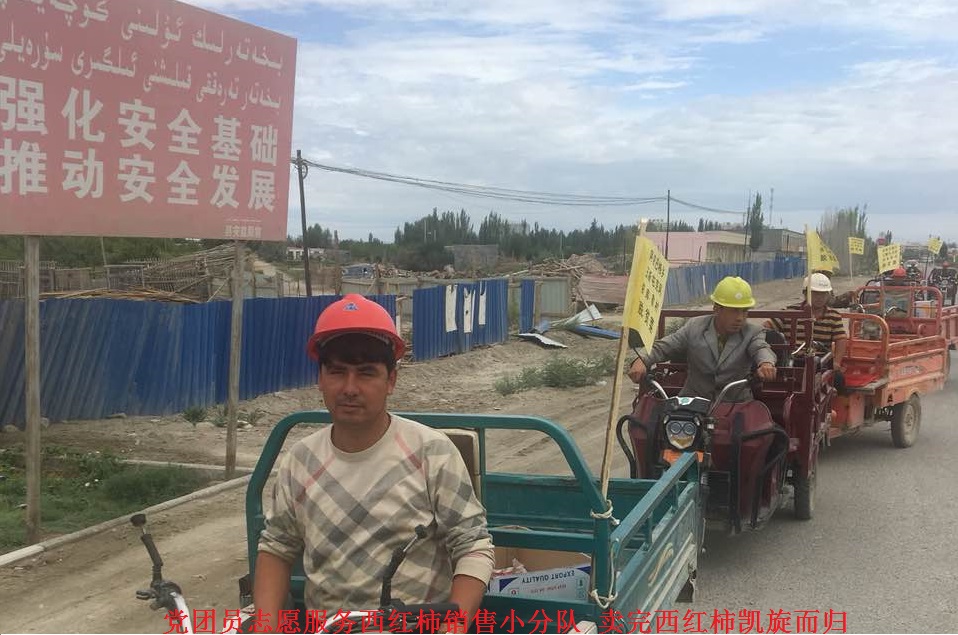 靠人不如靠己!工作队队长兼第一书记王馨决定带领贫困户到阿瓦提县各个批发市场、菜市场等地去联系销路。6月11日晚,工作队组织贫困户连夜采摘第一批成熟的西红柿,然后分类装箱打包,装了50箱西红柿,每箱20公斤,该村4个小队出动电动三轮车20辆组成党团员志愿服务西红柿销售小分队, 于6月12日凌晨4点半出发赶往阿瓦提县批发市场。工作队还帮助贫困户连夜准备了维汉双语《西红柿销售宣传单》和录好宣传西红柿销售口号的小喇叭,为西红柿的销售进行宣传造势。