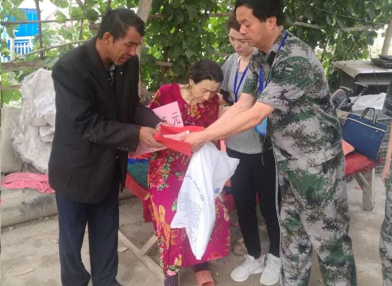“还没有去看病吗?抓紧时间赶快去看病啊!这是来自阿克苏检察分院各族干警和社会各界人士的一点心意,有我们在呢,不要放弃治疗,我们一起努力。”6月13日天刚刚亮,玉斯屯克塔木托格拉克村“访惠聚”工作队和村干部来到吐尼沙汗·吾斯曼家里,第一书记安尼瓦尔·坎吉拿着一份沉甸甸的红包交给了癌症患者吐尼沙汗·吾斯曼。吐尼沙汗·吾斯曼用微弱的声音流着泪说道:“谢谢,谢谢,有了你们的帮助我又能多活一天了。”