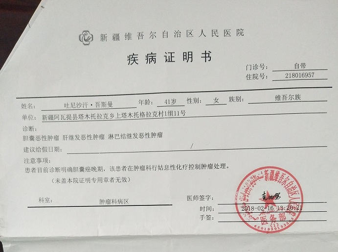 低保贫困户吐尼沙汗·吾斯曼是阿瓦提县塔木托格拉克乡玉斯屯克塔木托格拉克村1组村民,一家5口人,家里仅有14亩地,年收入不足3000元。多年以来,吐尼沙汗·吾斯曼肝病缠身,年初又被诊断出肝癌晚期,治疗所需的巨额费用给原本就贫困的家庭雪上加霜,让吐尼沙汗·吾斯曼一家为治病陷入了绝望。为了给吐尼沙汗·吾斯曼治病,库尔班·木力达吾提四处借钱,好不容易凑了3万元将吐尼沙汗·吾斯曼送到自治区人民医院,经过1个疗程的治疗,吐尼沙汗·吾斯曼的病情有所好转。但是好景不长,吐尼沙汗·吾斯曼在家里病情一天天恶化,需要再次到医院进行康复治疗。库尔班·木力达吾提一家再一次陷入绝望,吐尼沙汗·吾斯曼只能放弃治疗,在家里忍受病痛折磨。