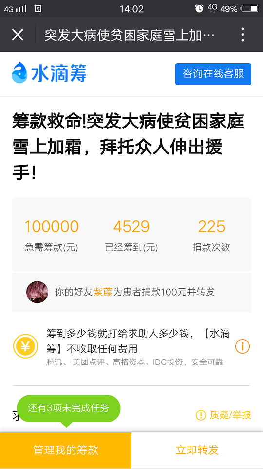 工作队在入户走访中了解到吐尼沙汗·吾斯曼的病情后,迅速召开会议研究帮扶措施,定期安排工作队员看望吐尼沙汗·吾斯曼,组织党团员、积极分子到吐尼沙汗·吾斯曼家里打扫庭院、棉花地里除草,并组织工作队、村两委和党员进行了1次爱心捐款。可是,吐尼沙汗·吾斯曼被病痛折磨的呻吟始终困扰住了工作队每一个队员的心,总想再为她做点事情,于是想到了在网上发布“水滴筹”进行筹款。经过复杂的申请手续,古丽皮艳·穆热吾敦终于在微信朋友圈、微博发起了第一条题为“捐款不分多少,善举不分先后,点点爱心,汇聚成河,让我们用点滴之情送她一点光明”的“水滴筹”筹款信息。这信息一发出,在短短的几个小时内,